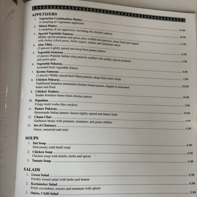 Begin your experience with delightful appetizers like the Samosa Chat—crispy pastries filled with mildly spiced potatoes and peas, or the Keema Samosas filled with sumptuous lamb. Vegetarians will revel in options such as Vegetable Pakoras and our mixed platter that showcases a sampling of the best starters.